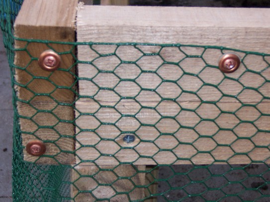 Nun wird der Draht befestigt. Hierzu eignen sich besonders solche Kupferschrauben mit Unterlegscheibe. Man fängt an einer Seite an. Am besten macht man dies zu Zweit. Einer zieht den Draht straff, der Andere schraubt.